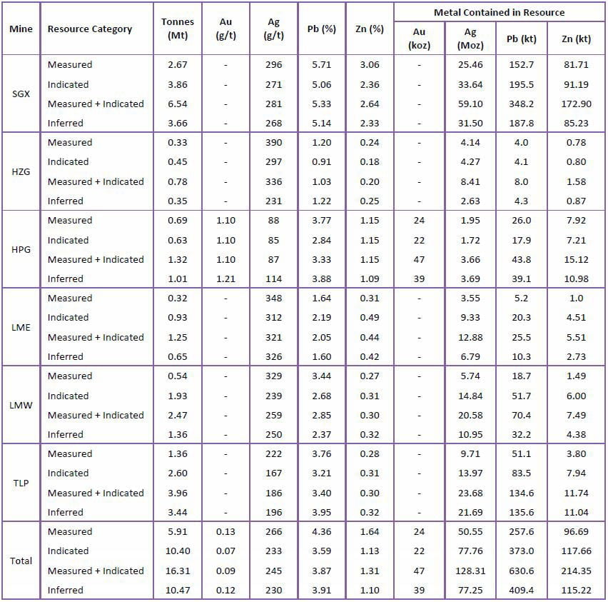 - Reported Mineral Resources of 16.31 million tonnes (inclusive of Mineral Reserves) in the Measured and Indicated categories grading 245 g/t Ag, 0.09 g/t Au, 3.87% Pb, and 1.31% Zn, containing 128.31 million ounces (oz) silver, 47,000 oz gold, 630,600 tonnes lead, and 214,350 tonnes zinc.