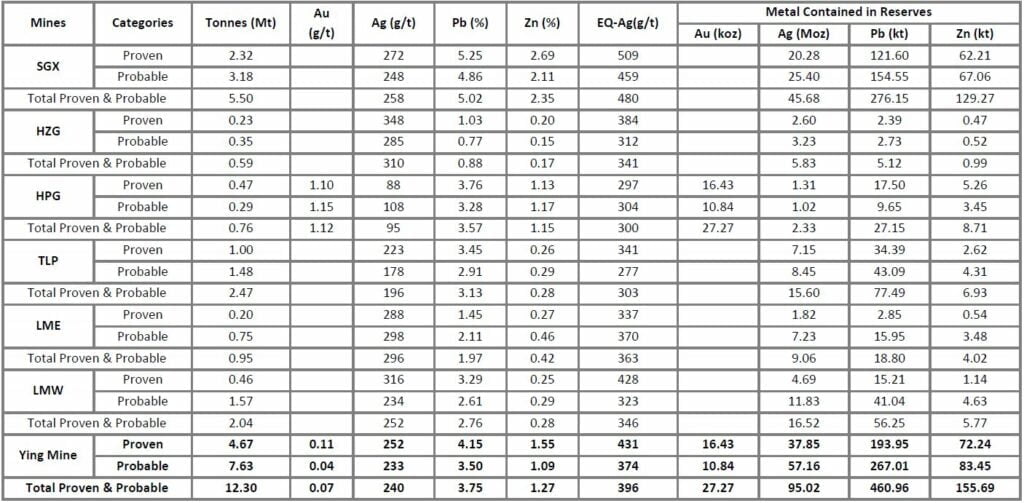 The Ying 2017 Technical Report defines Mineral Reserves of 12.30 million tonnes in the Proven and Probable categories grading 240 g/t Ag, 0.07 g/t Au, 3.75% Pb, and 1.27% Zn, containing 95.02 million oz silver, 27,270 oz gold, 460,960 tonnes lead, and 155,690 tonnes zinc. For the property as a whole, total Mineral Reserve tonnes are noted to be 75% of Mineral Resource (Measured plus Indicated) tonnes. Silver, lead and zinc Mineral Reserve grades are 99%, 97% and 97% respectively of the corresponding Measured plus Indicated Mineral Resource grades. Metal content conversion for silver, lead and zinc is between 73% and 75%.