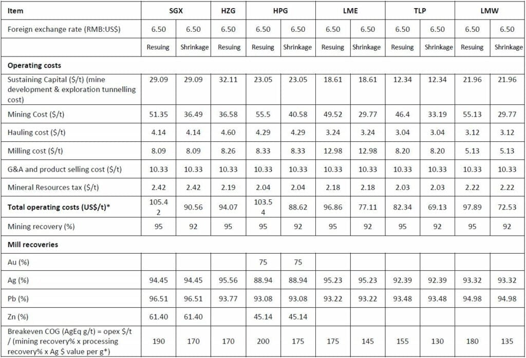 Stope Cut-off grades (Ag/Eq g/t): SGX – 190 Resuing, 170 Shrinkage; HZG – 170 Resuing; HPG – 200 Resuing, 175 Shrinkage; LME -175 Resuing, 145 Shrinkage; LMW -180 Resuing, 135 Shrinkage; TLP – 155 Resuing, 130 Shrinkage.