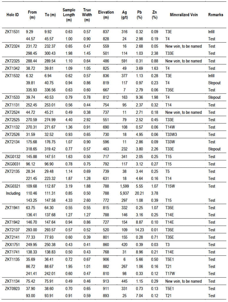 - Hole ZKG0321 intersected a 3.19 meter (“m”) interval from 109.68m to 112.87m, 1.88m true width, of vein T15W grading 1,599 grams per tonne (“g/t”) silver (“Ag”), 5.55% lead (“Pb”) and 1.07% zinc (“Zn”) at the 788m elevation, including a 0.85m interval, 0.50m true width, grading 5,937g/t Ag, 20.21% Pb and 3.78% Zn, and a 4.33m interval from 143.25m to 147.58m, 2.60m true width, of vein T15 grading 297g/t Ag, 1.08% Pb and 0.39% Zn at the 772m elevation.