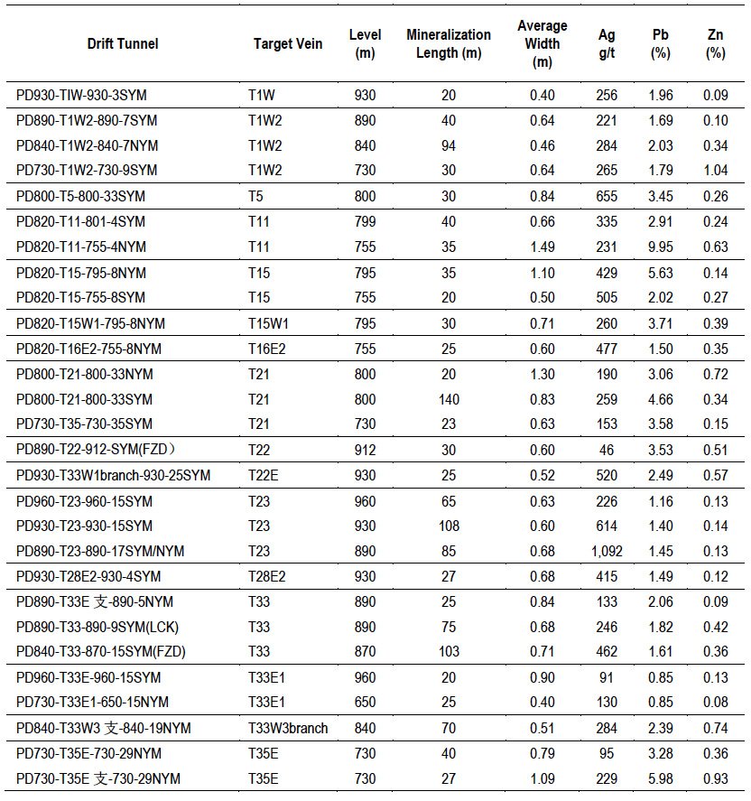 Exploration tunneling was conducted between the 990m and the 650m levels via access adits PD960, PD930, PD890, PD840, PD820, PD800 and PD730. A total of 6,287m of exploration tunneling, including 3,158m drift tunneling and 2,437m crosscut tunneling, was driven along and across major production vein structures, and 2,568 channel samples were collected. As of September 30, 2015, the on-going exploration tunneling program exposed a total of 1,414m mineralization, 0.70m in average width, grading 408g/t Ag, 3.44% Pb and 0.36% Zn. The exposed mineralization constitutes 45% of the completed 3,158m drift tunneling.