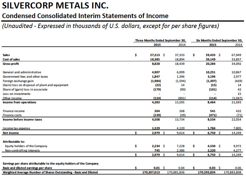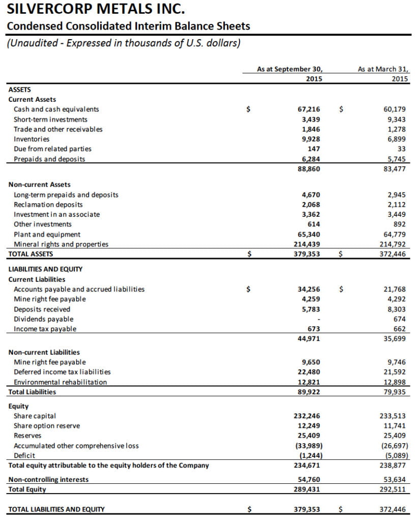 VANCOUVER, British Columbia – November 12, 2015 – Silvercorp Metals Inc. (“Silvercorp” or the “Company”) (TSX: SVM) reported its financial and operating results for the second quarter ended September 30, 2015 (“Q2 Fiscal 2016”). All amounts are expressed in US Dollars.