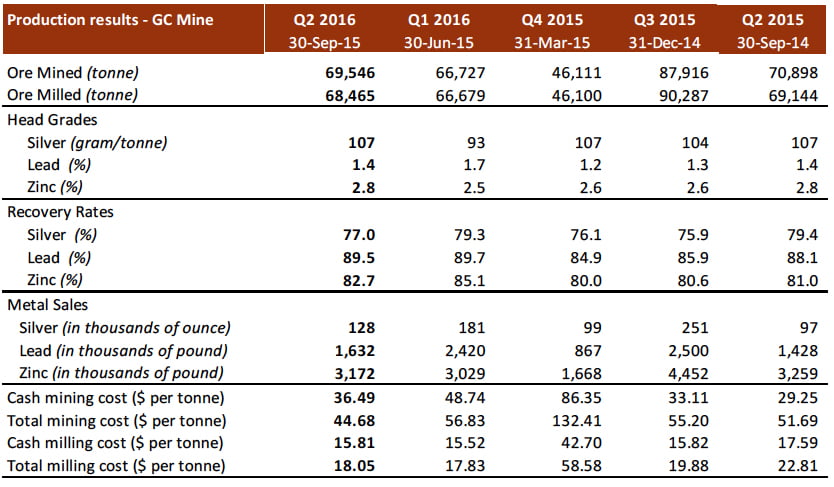 The head grades at GC mine were 107 g/t for silver, 1.4% for lead, and 2.8% for zinc in Q2 Fiscal 2016, which are comparable to the head grades in Q2 Fiscal 2015.