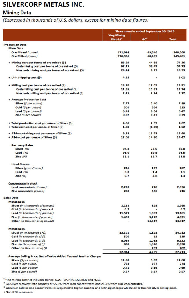 All in sustaining costs and all in costs, net of by-product credits, at the Ying Mining District for the six months ended September 30, 2015 was $9.52 and $10.86 per ounce of silver compared to $8.44 and $17.79, respectively, in same prior year period.