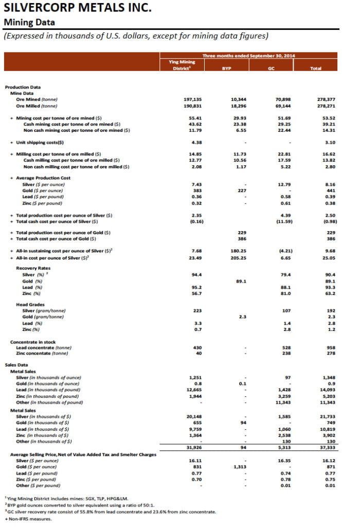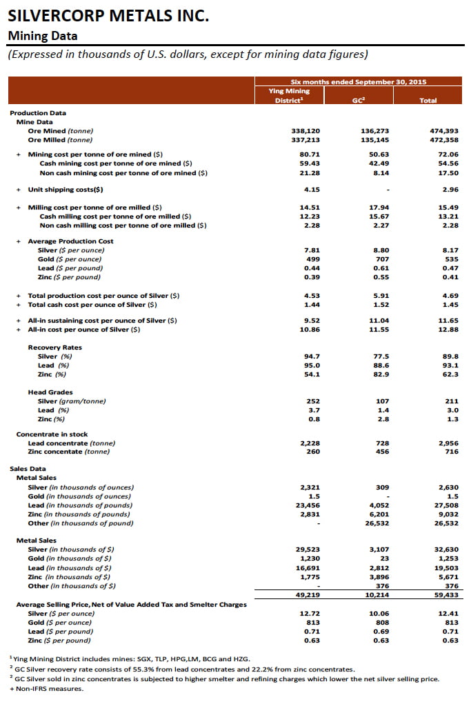 In Q2 Fiscal 2016, the Company sold 1.3 million ounces of silver, 13.2 million pounds of lead, and 4.6 million pounds of zinc, compared to 1.3 million ounces of silver, 14.1 million pounds of lead, and 5.2 million pounds of zinc, respectively, in Q2 Fiscal 2015. The decrease of metal sales is mainly due to the Company intentionally increasing its inventory of concentrates in reaction to lower metal prices. As at September 30, 2015, the Ying Mining District had 2,228 tonnes of lead concentrates and 260 tonnes of zinc concentrates in inventory, 1,798 and 220 tonnes higher, respectively, compared to 430 tonnes of lead concentrates and 40 tonnes of zinc concentrates in stock as at September 30, 2014. The estimated metals contained in the concentrates inventory as at September 30, 2015, are approximately 0.2 million ounces of silver, 2.0 million pounds of lead, and 0.2 million pounds of zinc higher, respectively, compared to the metals contained in concentrates inventory as at September 30, 2014.