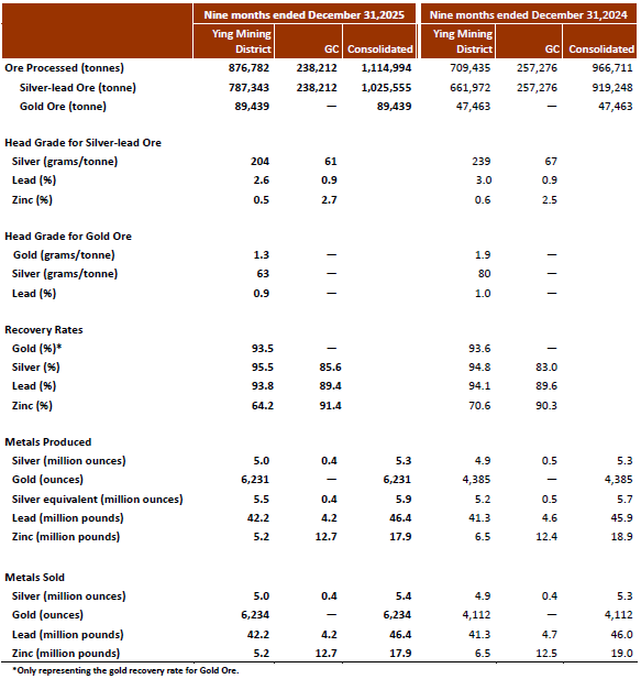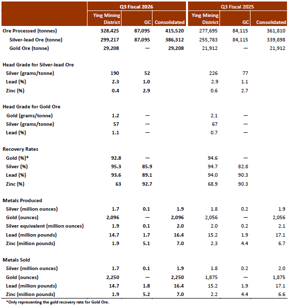 The Ying Mining District processed 328,425 tonnes of ore, up 18% over Q3 Fiscal 2025. Approximately 1.7 million ounces of silver, 2,096 ounces of gold, or 1.9 million ounce of silver equivalent, plus 14.7 million pounds of lead, and 1.9 million pounds of zinc were produced, representing production an increase of 2% in gold and decreases of 2%, 4%, 4%, and 16% in silver, silver equivalent, lead and zinc, respectively, over Q3 Fiscal 2025. Lower production was due to lower head grades, as a result of the XRT sorter undergoing maintenance in October 2025 and higher dilution associated with an increase in shrinkage mining. A total of 76,607 m of drilling and 19,917 m of exploration tunneling were completed in Q3 Fiscal 2026.