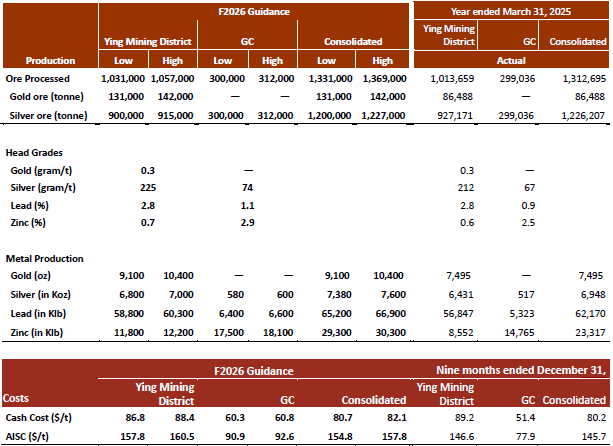 The Ying Mining District plans to process 1,031,000 to 1,057,000 tonnes of ore, to produce 9,100 to 10,400 oz of gold, 6,800 to 7,000 Koz of silver, 58,800 to 60,300 Klbs of lead, and 11,800 to 12,200 Klbs of zinc for Fiscal 2026. This production guidance represents production increases of 2% to 4% in ore, 21% to 39% in gold, 6% to 9% in silver, 3% to 6% in lead and 38% to 43% in zinc, compared to the Fiscal 2025 results.