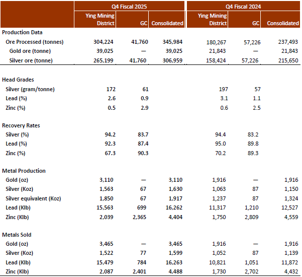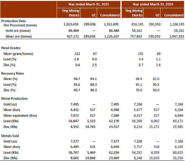 At the Ying Mining District, 1,013,659 tonnes of ore were processed, up 24% over Fiscal 2024. A total of 6,431 Koz of silver, 7,495 oz of gold, or 7.495 Koz of silver equivalent, 56,847 Klbs of lead, and 8,552 Klbs of zinc were produced, representing increases of 13%, 3%, 12%, 1% and 4%, respectively, in silver, gold, silver equivalent, lead and zinc over Fiscal 2024.