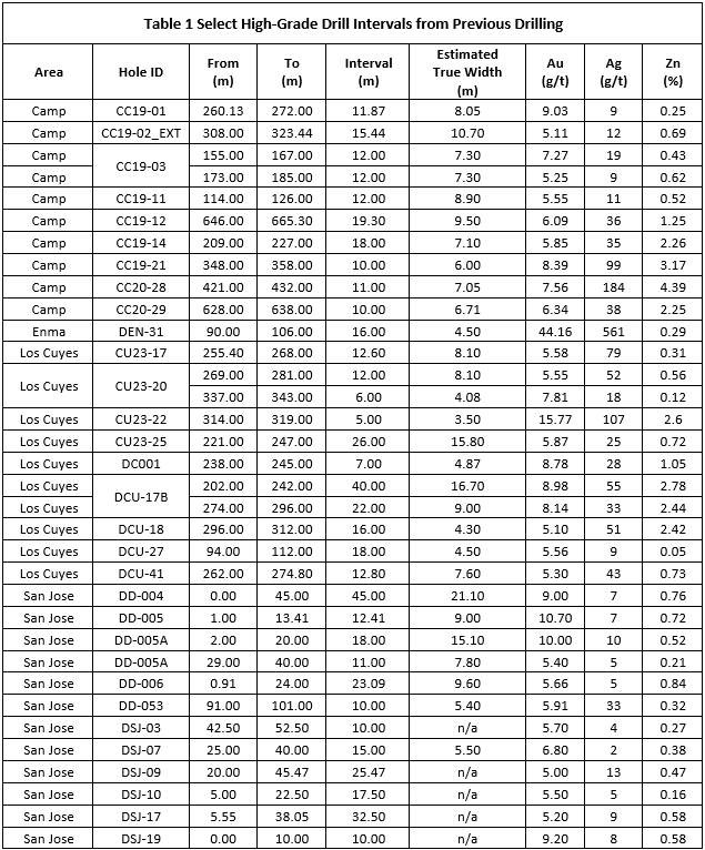 - Los Cuyes: DCU-17B, 8.98 g/t Au over 16.7 m true width from 202 m