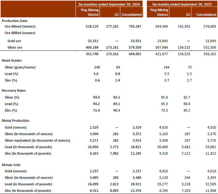 At the Ying Mining District, a total of 272,046 tonnes of ore were mined in Q2 Fiscal 2025, up 23% over Q2 Fiscal 2024, and 210,498 tonnes of ore were milled, down 1% over Q2 Fiscal 2024. Approximately 1.5 million ounces of silver, 1,183 ounces of gold, 1.6 million ounces of silver equivalent, 12.0 million pounds of lead, and 1.8 million pounds of zinc were produced, representing a production increase of 1% in silver and decreases of 52%, 7%, 20%, and 18%, respectively, in gold, silver equivalent, lead and zinc over Q2 Fiscal 2024. Silver head grade of 240 g/t was higher than the Company’s Fiscal 2025 annual guidance of 235 g/t. The decrease in gold, lead and zinc production is mainly due to i) processed ore is 1% less with approximately 129,000 tonnes of unprocessed ore stockpiled and ii) lower lead and zinc head grades.