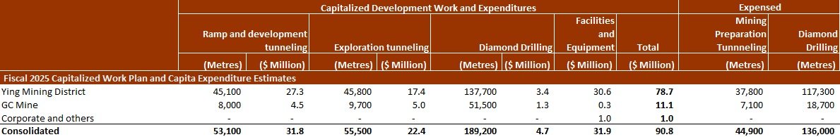 For the GC Mine, the Company plans to: i) complete and capitalize 8,000 metres of transportation ramps and mining development tunnels at estimated costs of $4.5 million ($562/m); ii) complete and capitalize 9,700 metres of exploration tunnels at estimated costs of $5.0 million ($515/m); iii) complete and capitalize 51,500 metres of diamond drilling at an estimated cost of $1.3 million; and iv) spend $0.3 million on equipment and facilities. The total capital expenditures at the GC Mine are budgeted at $11.1 million in Fiscal 2025.