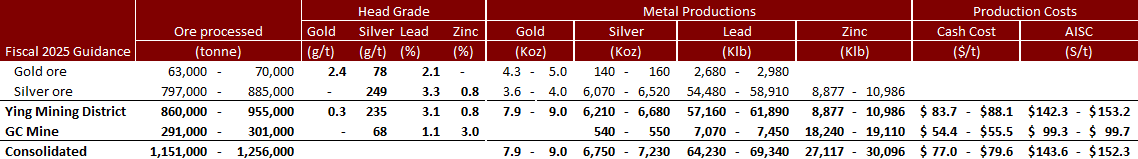 The Ying Mining District plans to mine and process 860,000 to 955,000 tonnes of ore, including 63,000 to 70,000 tonnes of gold ore with an expected head grade of 2.4 g/t gold, to produce approximately 7,900 to 9,000 ounces of gold, 6.2 to 6.7 million ounces of silver, 57.2 to 61.9 million pounds of lead, and 8.9 to 11.0 million pounds of zinc for Fiscal 2025. This production guidance represents production increases of approximately 5% to 17% in ore, 8% to 23% in gold, 9% to 18% in silver, 2% to 10% in lead, and 8% to 34% in zinc compared to the actual production in Fiscal 2024.