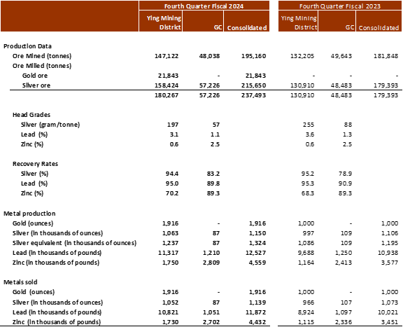 In Q4 Fiscal 2024, a total of 147,122 tonnes of ore were mined at the Ying Mining District, up 11% over Q4 Fiscal 2023, and 180,267 tonnes of ore were milled, up 38% over Q4 Fiscal 2023. Approximately 1.1 million ounces of silver, 1,916 ounces of gold (or 1.2 million ounces of silver equivalent), 11.3 million pounds of lead, and 1.8 million pounds of zinc were produced, representing production increases of 92%,7%, 14%, 17%, and 50%, respectively, in silver, gold, silver equivalent, lead and zinc over Q4 Fiscal 2023.