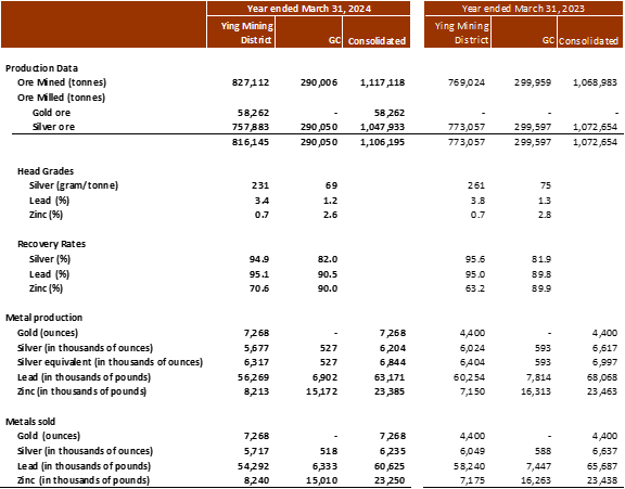 At the Ying Mining District, 827,112 tonnes of ore were mined, up 8% over Fiscal 2023, and 816,145 tonnes of ore were milled, up 6% over Fiscal 2023. Approximately 5.7 million ounces of silver, 7,268 ounces of gold (or 6.3 million ounces of silver equivalent), 56.3 million pounds of lead, and 8.2 million pounds of zinc were produced, representing increases of 65% and 15%, respectively, in gold and zinc, and decreases of 6%, 1% and 7%, respectively, in silver, silver equivalent and lead over Fiscal 2023.